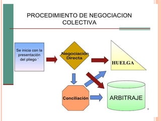 La negociación colectiva debe iniciarse dentro de los 60 días previos a la fecha de caducidad de la convención vigente. Una vez presentado el pliego de reclamos, la negociación directa entre las partes debe comenzar dentro de los 10 días siguientes. Las partes están obligadas a negociar de buena fe y abstenerse de acciones perjudiciales para la otra parte. Si no hay acuerdo, pueden recurrir a la conciliación, arbitraje o ejercicio del derecho a huelga. El producto de la negociación es la convención colect