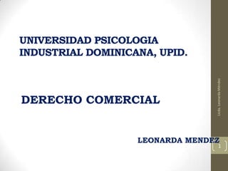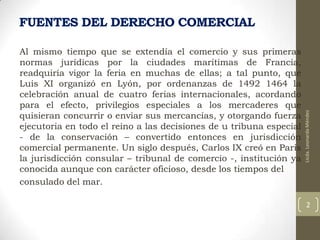 El resumen describe las fuentes del derecho comercial en Francia. En el siglo 15, Luis XI organizó ferias comerciales internacionales en Lyon y otorgó privilegios a los mercaderes. Un siglo después, Carlos IX creó un tribunal de comercio en París. Estas ordenanzas resolvían cuestiones específicas, mientras que los usos y costumbres constituían el derecho comercial en general. Actualmente, el código de comercio es la fuente principal del derecho comercial dominicano, con el código civil y los usos comerciales como fuentes