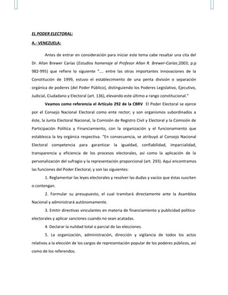 Este documento describe y compara los poderes electorales de Venezuela y Costa Rica. En Venezuela, la Constitución de 1999 estableció un poder electoral independiente llamado Consejo Nacional Electoral. En Costa Rica, la Constitución de 1949 creó el Tribunal Supremo de Elecciones como cuarto poder del estado y responsable de organizar elecciones. Ambos países tienen organismos electorales especializados y autónomos encargados de llevar a cabo procesos electorales libres e imparciales.