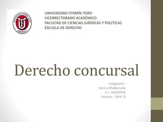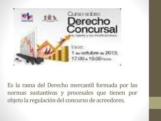 El documento habla sobre derecho concursal. Explica que el derecho concursal regula situaciones de insolvencia de deudores respecto a varios acreedores. Ofrece dos soluciones posibles a la crisis económica: un convenio entre el deudor y acreedores o la liquidación ordenada del patrimonio del deudor. También describe los requisitos para solicitar un atraso, que permite a un comerciante solvente pero sin liquidez diferir pagos por causas ajenas a su voluntad.