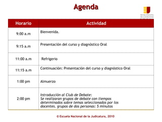 El documento presenta la agenda de un curso de Derecho Constitucional que se llevará a cabo en la Escuela Nacional de la Judicatura. El curso tendrá encuentros presenciales y actividades virtuales durante 12 semanas. Se dividirá en seis módulos que cubren temas como derecho constitucional, estado social y democrático de derecho, y tutela judicial efectiva. El curso busca desarrollar aptitudes para el ejercicio del derecho constitucional.