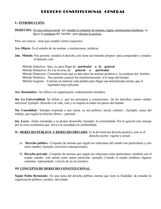 Este documento presenta una introducción al derecho constitucional general. Explica que el derecho es una ciencia social que estudia las normas y instituciones jurídicas. Luego describe los métodos y requisitos para que el derecho sea considerado una ciencia, como tener un objeto de estudio definido y ser sistemático. También distingue entre derecho público, que regula las relaciones del estado, y derecho privado, que regula las relaciones entre particulares. Finalmente, define el derecho constitucional como el conjunto de normas fundamentales que organizan el estado y