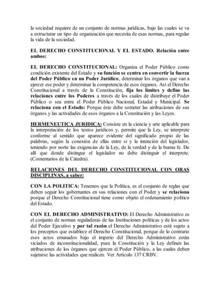 El documento define varios conceptos clave relacionados con el derecho constitucional. Explica que el derecho constitucional estudia la organización del estado y los derechos y deberes de los ciudadanos. También describe las relaciones entre el derecho constitucional y otras disciplinas como la política, el derecho administrativo y el derecho penal. Finalmente, define el poder constituyente como la voluntad soberana de un pueblo para establecer un estado y darse una organización jurídica y política.