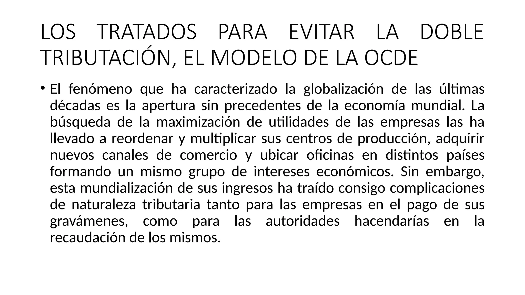 El documento analiza la complejidad de la doble tributación internacional en el contexto de la globalización, destacando la importancia de la residencia fiscal y los tratados de doble imposición. Se abordan los mecanismos que los países utilizan para evitar la doble tributación y el fenómeno del 'treaty shopping', que puede facilitar la evasión fiscal. Además, se explican los métodos de eliminación de la doble imposición, incluyendo el método de exención y el método de imputación, y su impacto en las rentas mundiales de los contribuyentes.