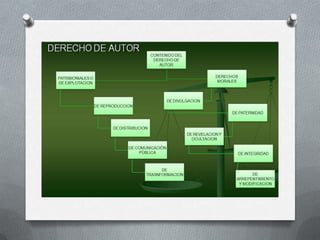 Este documento resume el origen y propósito del derecho de autor, las obras y creaciones que protege en Internet (como programas, bases de datos, obras audiovisuales y multimedia), y aquellas que no protege (como noticias y leyes). También describe posibles usos restringidos de obras protegidas en Internet y las sanciones por infracciones al derecho de autor.