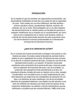 Este documento trata sobre los derechos de autor. Explica que los derechos de autor protegen a los creadores de obras intelectuales al reconocerles la autoría de sus creaciones y darles control sobre cómo se usan y explotan comercialmente. También describe la historia de los derechos de autor, las características y tipos de derechos, así como lo que protegen específicamente los derechos de autor.
