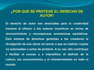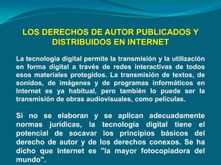 Este documento discute los derechos de autor en Internet. Explica que la tecnología digital permite la transmisión digital de obras protegidas a través de redes interactivas como Internet. Sin normas jurídicas adecuadas, esto podría socavar los principios del derecho de autor. En 1996, la OMPI celebró dos tratados para actualizar la protección de derechos de autor y derechos conexos para adaptarse a las nuevas tecnologías como Internet.