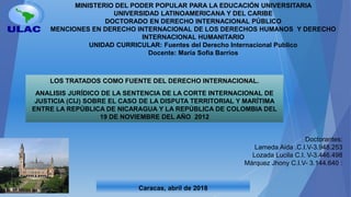 El documento analiza la disputa territorial y marítima entre Nicaragua y Colombia, centrándose en la interpretación de tratados por parte de la Corte Internacional de Justicia (CIJ). Se discuten las implicaciones legales de la sentencia del 19 de noviembre de 2012, así como los métodos hermenéuticos aplicados en la resolución del caso. Además, se evalúan las fuentes del derecho internacional y cómo estas influyen en la soberanía y derechos marítimos en la región.