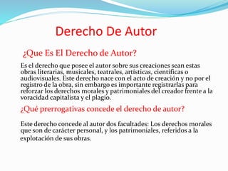 El documento explica los conceptos clave del derecho de autor, incluyendo que este derecho surge con la creación de una obra y otorga al autor derechos morales y patrimoniales sobre su obra, y que los derechos patrimoniales permiten al autor obtener una retribución financiera por el uso de su obra mientras que los derechos morales le permiten reivindicar la autoría y oponerse a modificaciones que puedan perjudicar su reputación. También resume los tipos de obras protegidas y la duración de la protección por derecho de autor.