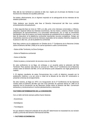1. El documento trata sobre la evolución del derecho del mar y la ordenación jurídica del espacio marítimo. 2. Se divide en tres fases principales: desde los inicios hasta 1945, desde 1945 hasta los años 1960, y desde los años 1960 hasta la Convención de 1982. 3. La Convención de 1982 establece cinco zonas marítimas: aguas interiores, mar territorial, zona contigua, zona económica exclusiva y alta mar.