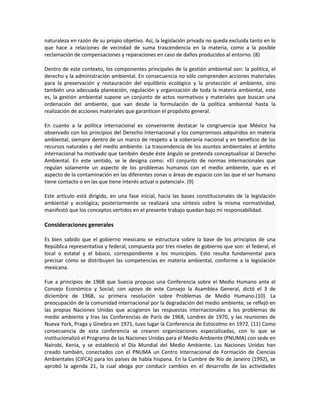 Este documento describe el desarrollo de la legislación ambiental en México. Comienza explicando el surgimiento del derecho ambiental como disciplina jurídica para regular las interacciones entre los seres humanos y el medio ambiente. Luego detalla algunos hitos clave en el desarrollo de la legislación ambiental mexicana, incluyendo la primera ley ambiental federal de 1971 y las reformas constitucionales de 1983 que establecieron bases para la protección ambiental. Finalmente, explica cómo la Constitución mexicana distribuye competencias ambientales entre los g
