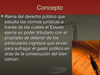 El derecho fiscal es la rama del derecho público que estudia las normas jurídicas a través de las cuales el Estado ejerce su poder tributario para obtener ingresos de los particulares y financiar el gasto público. La jurisprudencia fiscal está constituida por las opiniones de especialistas en diversos temas fiscales. Los impuestos son obligaciones pecuniarias a favor del Estado que surgen por la potestad tributaria para financiar gastos estatales según el principio de capacidad contributiva.