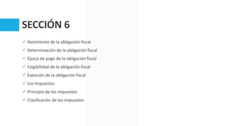 Este documento trata sobre conceptos básicos del derecho fiscal como el nacimiento de la obligación fiscal, su determinación, época de pago y exigibilidad. También aborda la exención de obligaciones fiscales y conceptos sobre impuestos como su definición, propósito y principios. Finalmente, identifica a quiénes les corresponde pagar impuestos en México como personas físicas, empresas y demás entidades gravadas.