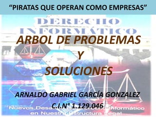 El documento describe un árbol de problemas y soluciones relacionado con piratas informáticos que operan como empresas. Los problemas incluyen influencias tecnológicas, falta de regulación y negligencias que permiten delitos sin normativa. Las soluciones propuestas son control, seguridad y eficacia a través de un organismo contralor que brinde certeza y confianza.