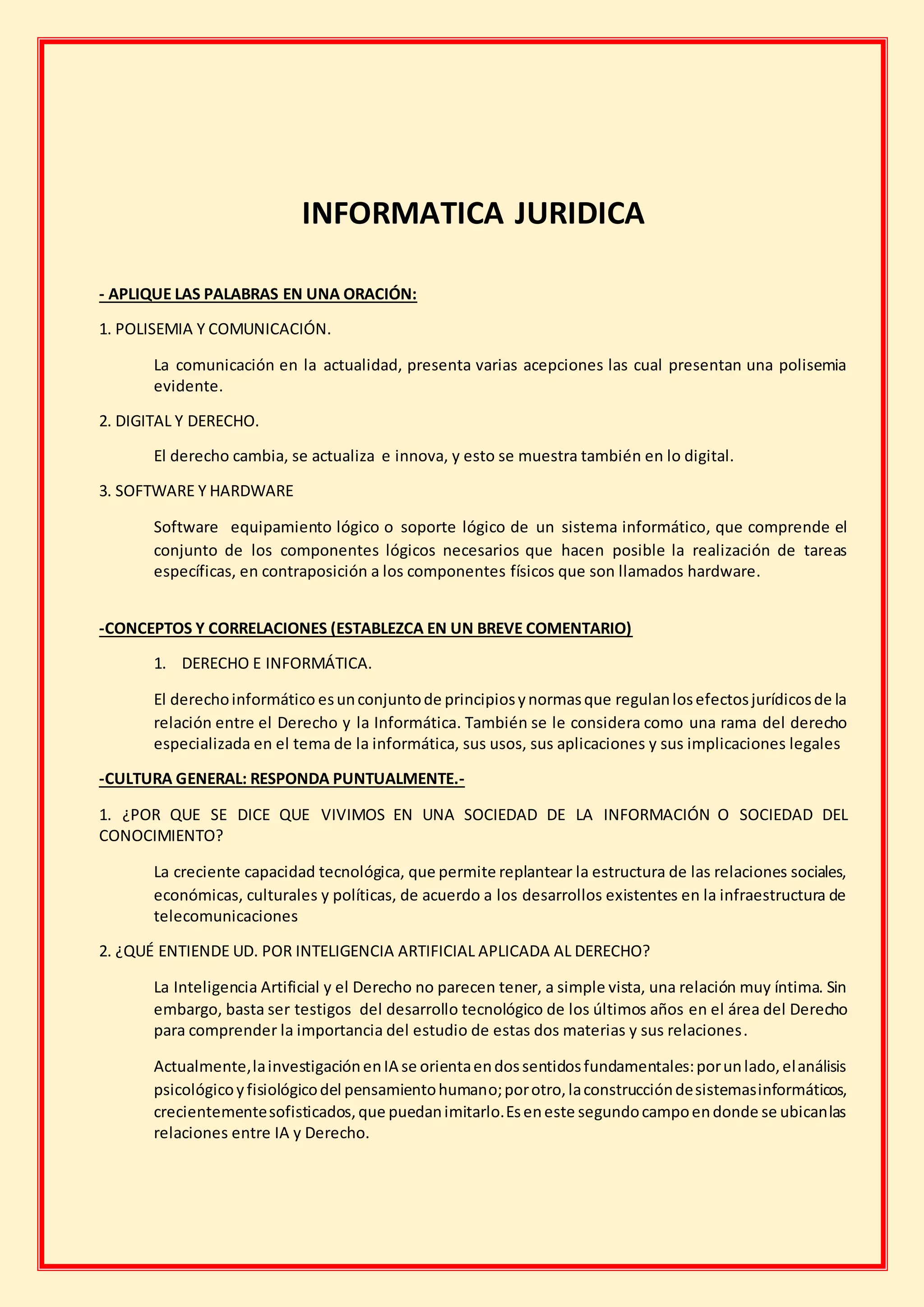 El documento trata sobre informática jurídica. Explica que la comunicación actual presenta polisemia y que el derecho se actualiza e innova en lo digital. Define software como el conjunto de componentes lógicos de un sistema y hardware como los componentes físicos. Establece que el derecho informático regula los efectos jurídicos de la relación entre derecho e informática. Finalmente, explica que vivimos en una sociedad de la información debido a la capacidad tecnológica y que la inteligencia artificial aplicada al derecho busca construir sistemas que