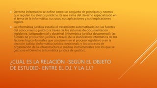 El documento compara el Derecho Informático y la Informática Jurídica. El Derecho Informático regula los efectos jurídicos de la informática y sus aplicaciones, mientras que la Informática Jurídica estudia el tratamiento automatizado de las fuentes del conocimiento jurídico, la producción jurídica y los procesos de gestión del Derecho a través de sistemas informáticos. La Informática Jurídica incluye la documentación, gestión y toma de decisiones jurídicas con el uso de tecnología.