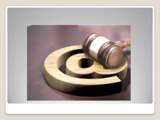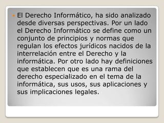 El documento trata sobre el derecho informático. Explica que el derecho informático se define como un conjunto de principios y normas que regulan los efectos jurídicos de la interrelación entre el derecho y la informática. También señala que la tecnología ha sido benéfica pero también puede usarse para la delincuencia. Por último, menciona algunas organizaciones como FIADI, ILATID y Alfa-Redi que promueven el estudio y desarrollo del derecho informático en Iberoamérica.
