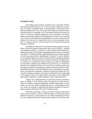 Este documento analiza la Ley venezolana de Derecho Internacional Privado durante sus tres años de vigencia. Resume algunas de las regulaciones más relevantes de la ley y plantea interrogantes sobre disposiciones específicas. También comenta el desarrollo de la jurisprudencia y doctrina sobre la ley. El balance general es positivo, aunque existen aspectos de la ley que requieren mayor análisis.