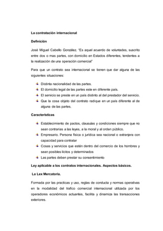 Este documento resume los principales aspectos de la contratación internacional y la ley aplicable a estos contratos. Define la contratación internacional y explica que se produce cuando las partes tienen diferentes nacionalidades, domicilios legales en países distintos, o cuando el objeto o servicio del contrato se ubica en un país diferente a alguna de las partes. Además, resume los principios de la Lex Mercatoria y los Principios UNIDROIT, que son fuentes importantes de derecho aplicables a los contratos internacionales.