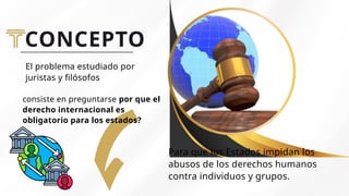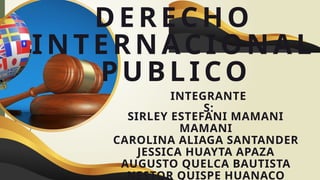 El derecho internacional público se centra en la obligación de los estados de proteger los derechos humanos y establecer un orden jurídico internacional. A lo largo de su evolución, ha surgido de teorías voluntaristas, normativistas y sociológicas que destacan la importancia del consentimiento estatal y de normas preexistentes. Su desarrollo ha sido influenciado por eventos históricos significativos como la paz de Westfalia, la creación de la ONU y la adopción de la Declaración Universal de Derechos Humanos.