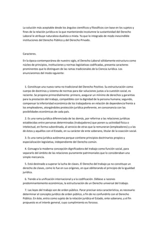 Este documento describe el derecho laboral como una rama autónoma del derecho que regula las relaciones entre empleadores y trabajadores. Define el derecho laboral y explica que regula las normas y principios que rigen dichas relaciones laborales. Además, destaca que el derecho laboral tiene una naturaleza dualista ya que integra instituciones de derecho público y privado. Finalmente, señala que el derecho laboral ha adquirido autonomía científica, jurídica y docente.