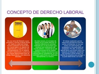 El Derecho Laboral regula el trabajo asalariado realizado bajo relación de dependencia y a cambio de una remuneración. Se caracteriza por regular relaciones asimétricas entre empleadores y empleados, siendo el empleado la parte débil que requiere protección. El Derecho Laboral tutela el trabajo humano realizado por cuenta ajena a través de normas que limitan la libertad de empresa en favor de los trabajadores.
