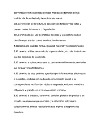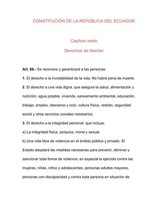 Este documento establece los derechos de libertad reconocidos en la Constitución de Ecuador. Incluye derechos como a la vida, integridad personal, igualdad, pensamiento libre, religión, objeción de conciencia, asociación, propiedad, entre otros. También regula las formas de trabajo y retribución laboral, reconociendo todos los tipos de trabajo y principios como el pleno empleo, igualdad salarial, seguridad e higiene laboral, organización sindical, huelgas, contratación colectiva y prohibición de la ter