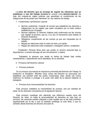 Este documento resume los fundamentos y principios del derecho laboral en Venezuela. Explica que el derecho laboral regula las relaciones entre empleadores y trabajadores, incluyendo normas sustantivas y adjetivas. Luego describe varios principios clave como el principio protector, la irrenunciabilidad de derechos, la continuidad y la primacía de la realidad. Finalmente, menciona algunos organismos laborales como el Ministerio de Trabajo y Asuntos Sociales.