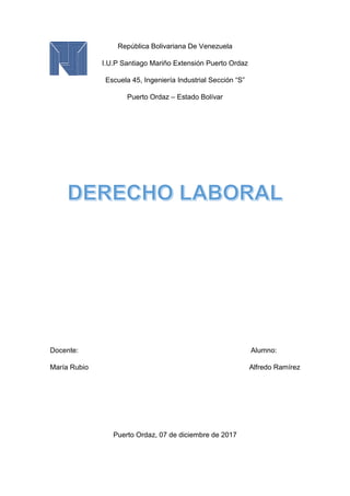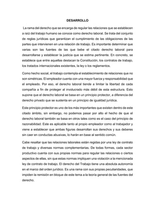 Este documento resume los principales aspectos del derecho laboral. El derecho laboral regula las relaciones laborales y garantiza el cumplimiento de las obligaciones de empleadores y empleados. Se basa en principios como la protección de los empleados y la razonabilidad para ambas partes. Las relaciones laborales están regidas por la ley de contrato de trabajo y normas complementarias de cada sector productivo.