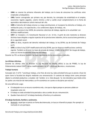 Este documento resume la evolución histórica del trabajo y el derecho laboral en Argentina, así como los conceptos fundamentales del derecho del trabajo. Explica las tres etapas históricas del trabajo (preindustrial, industrial y posindustrial), los primeros cuerpos normativos laborales en Argentina desde 1904, y las leyes y reformas laborales más importantes desde esa época hasta la actualidad. También define conceptos clave como trabajo, relación de dependencia, derecho del trabajo individual y colectivo, y sus principios protectores.