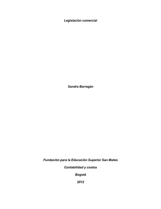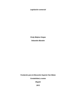 Este documento analiza la legislación comercial de varios países como Canadá, Colombia y otros. Explica brevemente la historia del derecho comercial a nivel mundial y define el derecho mercantil. Luego compara aspectos de la legislación comercial de Canadá y Colombia, como la regulación de operaciones comerciales y los requisitos de los contratos.