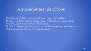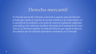El Derecho Mercantil regula las normas relativas a los comerciantes y los actos de comercio, así como las relaciones jurídicas que surgen de la realización de estos actos. Históricamente, el Derecho Mercantil se desarrolló de forma separada del Derecho Civil en las ciudades comerciales medievales, donde los gremios de mercaderes se organizaron para defender sus intereses. Actualmente, el Derecho Mercantil regula transacciones como compras y ventas, contratos, hipotecas, herencias, registros mercantiles