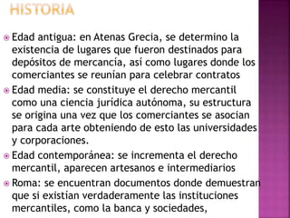 El documento resume brevemente la evolución histórica del derecho mercantil desde la antigua Grecia hasta la época contemporánea. Explica que el derecho mercantil es una rama del derecho privado que rige las relaciones comerciales mediante normas, leyes y códigos. Finalmente, enumera diez actividades consideradas comerciales según el derecho.