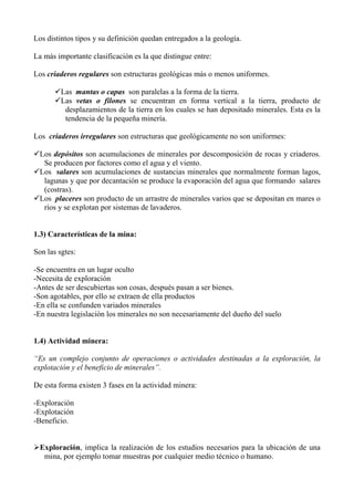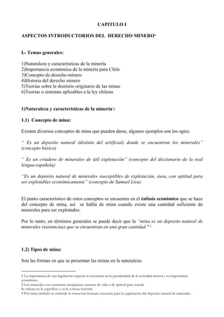 Este documento presenta una introducción al derecho minero chileno. Explica conceptos clave como la definición de mina, los tipos de minas, las características de la actividad minera y su importancia económica para Chile. También resume las teorías sobre el dominio de las minas, la historia del derecho minero y los sujetos involucrados en la actividad minera. Finalmente, resume brevemente la evolución de la legislación minera chilena.