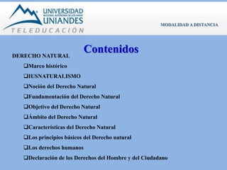 El documento presenta una introducción al derecho natural, discutiendo su marco histórico, fundamentación, objetivo y características. Explica que el derecho natural se basa en la naturaleza humana y la razón, y que tiene como principios básicos el derecho a la vida, la propiedad y la resistencia a los gobernantes despóticos. Finalmente, resume la Declaración de los Derechos del Hombre y del Ciudadano de 1789, que definió los derechos humanos como universales.