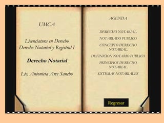 El documento presenta información sobre el derecho notarial, incluyendo definiciones de notario público y derecho notarial, principios del derecho notarial como la fe pública y la legalidad, y descripciones de sistemas notariales como el sistema latino y el sistema sajón.