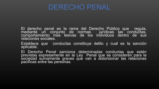 El documento trata sobre el derecho penal y el ordenamiento jurídico. Explica que el derecho penal regula las conductas lesivas mediante normas y establece qué conductas constituyen delitos y sus sanciones correspondientes. Además, describe que el ordenamiento jurídico forma un sistema unificado, coherente y completo derivado de la constitución y comprende otras fuentes como leyes, tratados y decisiones judiciales vinculantes.