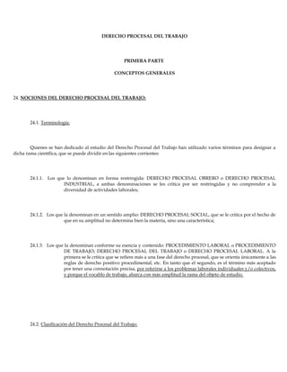 1) El documento describe conceptos generales del derecho procesal del trabajo, incluyendo definiciones, principios, clasificaciones y relaciones con otras ramas del derecho. 2) Explica que el derecho procesal del trabajo se divide en individual y colectivo, y describe los diferentes órganos jurisdiccionales como juzgados de trabajo, cortes de apelación, y tribunales de conciliación y arbitraje. 3) Inicia la descripción del procedimiento ordinario laboral individual, cubriendo su naturaleza, características y a las partes involuc