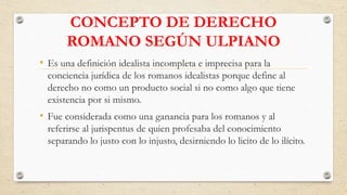 Este documento presenta la información de un trabajo final de semestre sobre el derecho romano. Resume los conceptos clave del derecho romano como la definición de justicia y equidad según Ulpiano, la clasificación del derecho romano en ius civile, ius gentium, ius naturale e ius publicus y privatus, y la persona jurídica y su capacidad jurídica en Roma. También describe elementos del matrimonio, la esclavitud y el proceso legal romano.