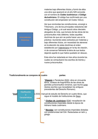 El documento describe el Corpus Juris Civilis, la más importante recopilación de derecho romano. Se compone de cuatro partes principales: el Digesto, las Institutas, el Código de Justiniano y las Novelas. También describe las principales fuentes del derecho romano como la costumbre, las leyes de las XII Tablas, las leyes comiciales, los plebiscitos, los senadoconsultos, los edictos, las respuestas de los jurisprudentes y las constituciones imperiales. El Corpus Juris Civilis codificó el derecho romano y ha sido