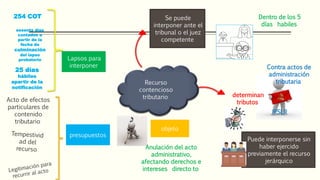 Este documento resume los principales aspectos del recurso contencioso tributario y los ilícitos tributarios en Venezuela. Explica que el recurso contencioso tributario se puede interponer ante el tribunal competente contra actos de administración tributaria que determinan tributos, dentro de los 5 días hábiles o sesenta días contados a partir de la culminación del lapso probatorio. Además, define los ilícitos tributarios como cualquier acción u omisión que viole las normas tributarias y señala que están regulados en el Código Orgánico Tribut