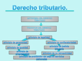 Este documento describe los principios fundamentales del derecho tributario venezolano, incluyendo la legalidad, generalidad, igualdad, no confiscatoriedad, progresividad y prohibición de impuestos pagaderos en servicios personales. Explica que el derecho tributario regula las normas para la recaudación de impuestos por el estado de acuerdo a la Constitución y se rige por estos principios inherentes al derecho.