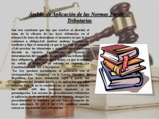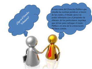 El documento trata sobre el derecho tributario. Explica que el derecho tributario estudia las normas jurídicas a través de las cuales el estado ejerce su poder tributario para obtener ingresos de los particulares y financiar el gasto público para el bien común. También describe que la ley tributaria rige por un tiempo determinado y es derogada cuando ya no cumple una necesidad jurídica. Finalmente, define los tributos como prestaciones en dinero que el estado exige en virtud de una ley para cubrir sus gastos.