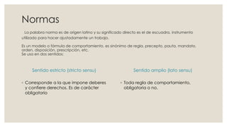 Este documento describe diferentes tipos de normas sociales. Explica que las normas son modelos de comportamiento y pueden ser obligatorias o no. Describe normas como reglas, leyes naturales, leyes jurídicas, juicios enunciativos, juicios normativos y diferentes tipos de normas sociales como normas tecnológicas, ideológicas, jurídicas, morales, convencionales, religiosas y consuetudinarias.