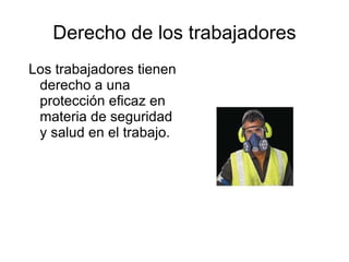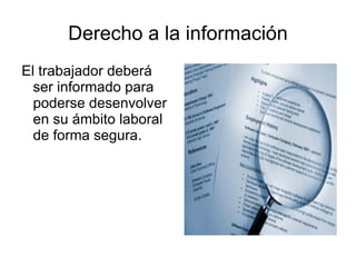 El documento describe los derechos de los trabajadores en materia de seguridad y salud en el trabajo, incluyendo el derecho a la protección, información, formación, participación, bienestar e interrupción de la actividad en caso de riesgo, así como el derecho a recibir vigilancia médica y reconocimientos que permitan diagnosticar su salud laboral.