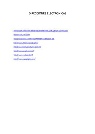 Este documento lista varias direcciones electrónicas de recursos en línea como hojas de datos técnicos, herramientas de creación de presentaciones digitales, plataformas para publicar libros y páginas web, y motores de búsqueda y redes sociales populares.