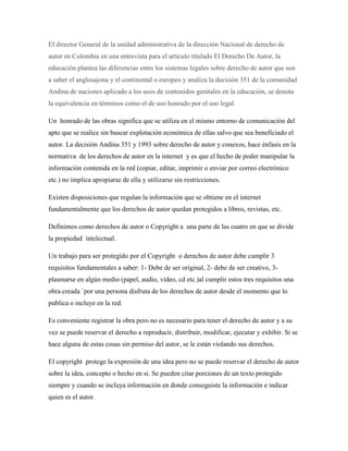 Este documento presenta un resumen de los derechos de autor en Colombia. Explica las diferencias entre los sistemas legales de derechos de autor anglosajón y continental, y analiza la Decisión 351 de la Comunidad Andina de Naciones sobre el uso de contenidos en educación. También define derechos de autor, los requisitos para que una obra sea protegida, y aspectos como el registro de obras, citaciones justas, y dominio público. Finalmente, concluye la importancia de los derechos de autor al publicar documentos en la web.