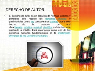 El documento habla sobre el derecho de autor y sus aspectos en el derecho informático. Explica que el autor es el titular del derecho de autor desde el momento de la creación de la obra. Define una obra como una expresión personal con originalidad que puede ser difundida. Finalmente, distingue entre los derechos morales no económicos del autor y los derechos patrimoniales que le permiten beneficiarse económicamente de su obra.