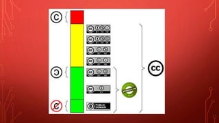 El documento explica los derechos de autor y las diferentes licencias asociadas a ellos. Explica que los derechos de autor protegen las creaciones intelectuales de sus creadores y que solo ellos pueden disponer de sus obras, como venderlas o reproducirlas. Luego describe las licencias de Copyright, Copyleft y Creative Commons, indicando que esta última ofrece seis tipos de licencias que permiten diferentes usos de una obra, siempre reconociendo a su autor.