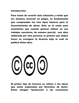 Este documento explica los tres tipos básicos de licenciamiento de obras: derechos de autor, dominio público y Creative Commons. También destaca la importancia de que los estudiantes aprendan a identificar estas licencias y a citar y parafrasear correctamente obras de otros autores en sus trabajos escolares para evitar el plagio.